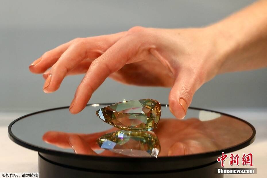 当地时间10月17日,苏富比在迪拜展出303.1克拉无暇黄钻。这颗名为“金色金丝雀”的切割钻石估价约为1500万美金。