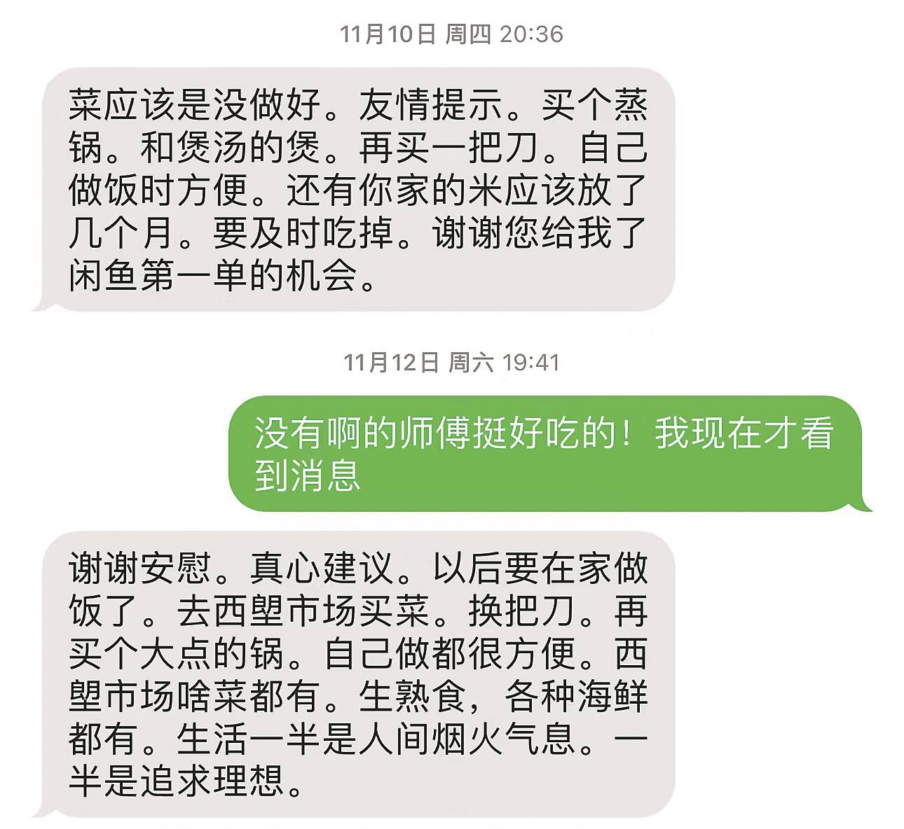 因为工作忙碌等缘故,丁丁的厨房里清锅冷灶,厨具几无,她也很少踏进。那天她请人上门代厨,“师傅是用最简单的厨具做的这顿饭”。服务结束后,对方给她发来一条短信,建议她如果以后要在家做饭,可以去哪里买菜,可以再添置什么厨具。短信的最后,这位厨师说:“生活一半是人间烟火气息,一半是追求理想。”