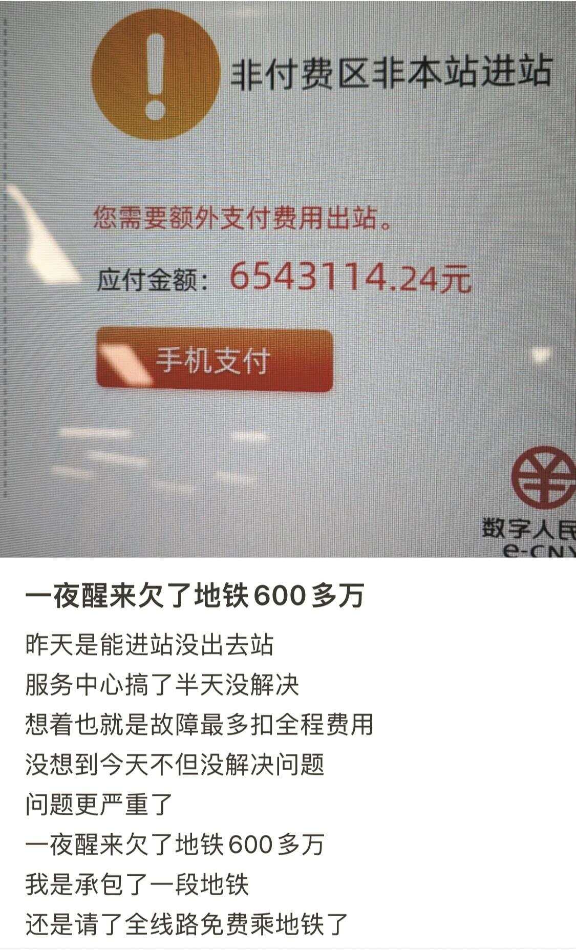 该网友同步发布了自己遭遇的情况:“昨天(5月7日)能进站但没法出站,服务中心搞了半天没解决,没想到今天不但没解决问题,问题更严重,一夜醒来欠了地铁600多万,我是承包了一段地铁,还是请全线路免费乘地铁了?”8日19时左右,该网友在评论里表示“地铁方面处理了一天没解决”。