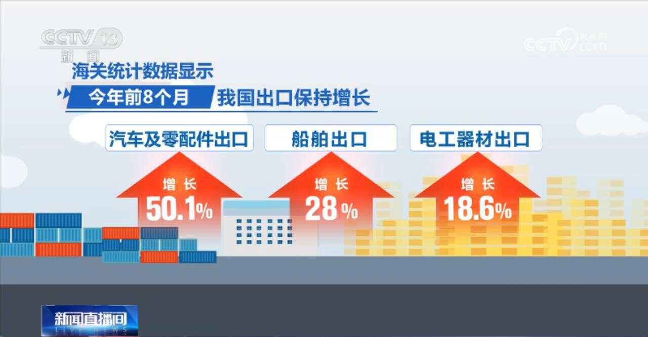 今年前8个月,我国出口保持增长。其中,机电产品出口8.97万亿元,同比增长3.6%,占同期我国出口总值的58%;汽车及零配件出口、船舶出口、电工器材出口分别增长50.1%、28%、18.6%。