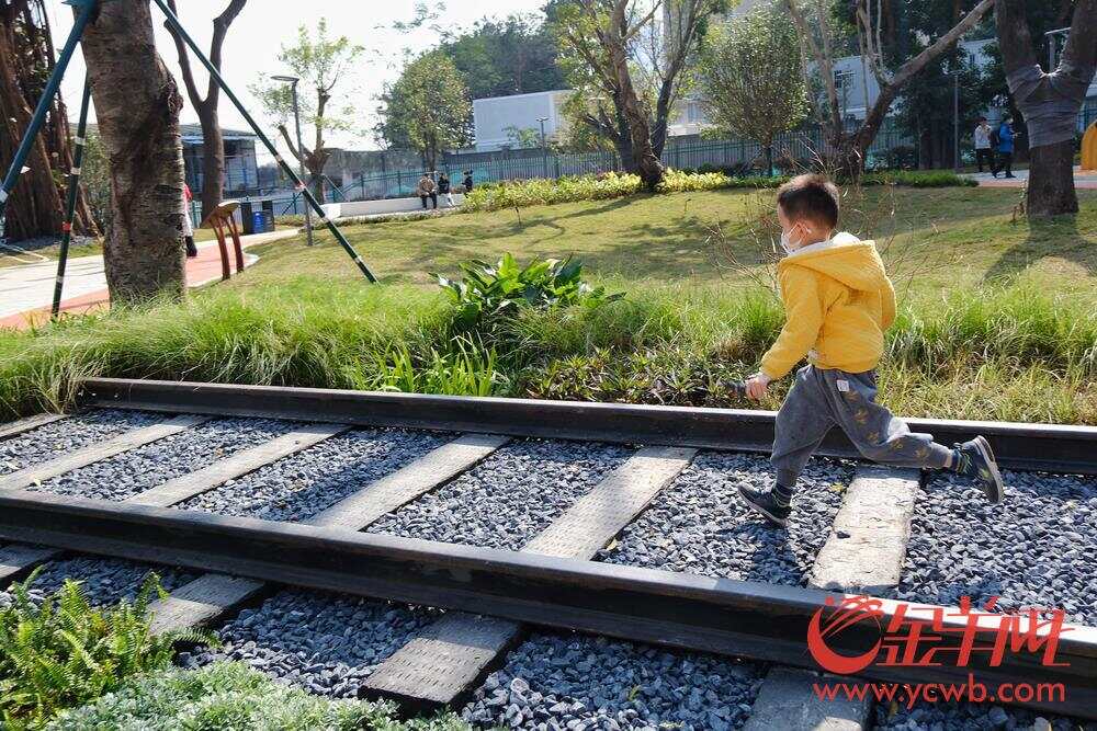 荔勤北路口袋公园,保留了一小段“火车路”,孩子欢乐奔跑