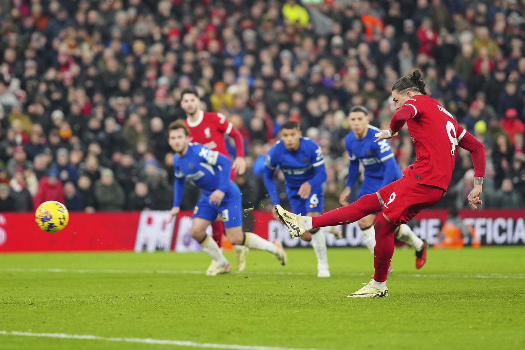 直到第71分钟,替补出场的恩昆库为切尔西扳回一球。“铁匠”努涅斯此役没穿射门靴,但还可以为队友创造机会。三名南美球星在第79分钟打出配合,麦卡利斯特直传发动进攻,努涅斯左路传中,迪亚斯抢点射门为利物浦锁定胜局。