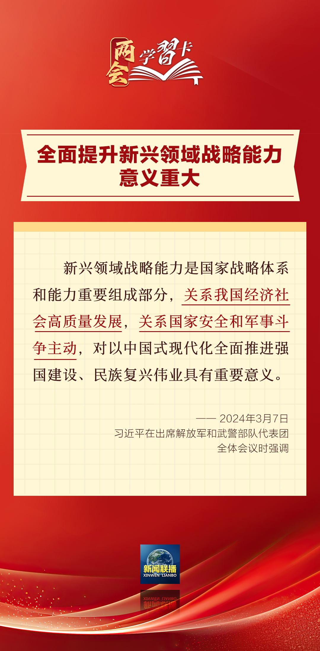 3月7日,习近平在出席解放军和武警部队代表团全体会议时强调,强化使命担当,深化改革创新,全面提升新兴领域战略能力。如何提升新兴领域战略能力?一起学习↓↓↓