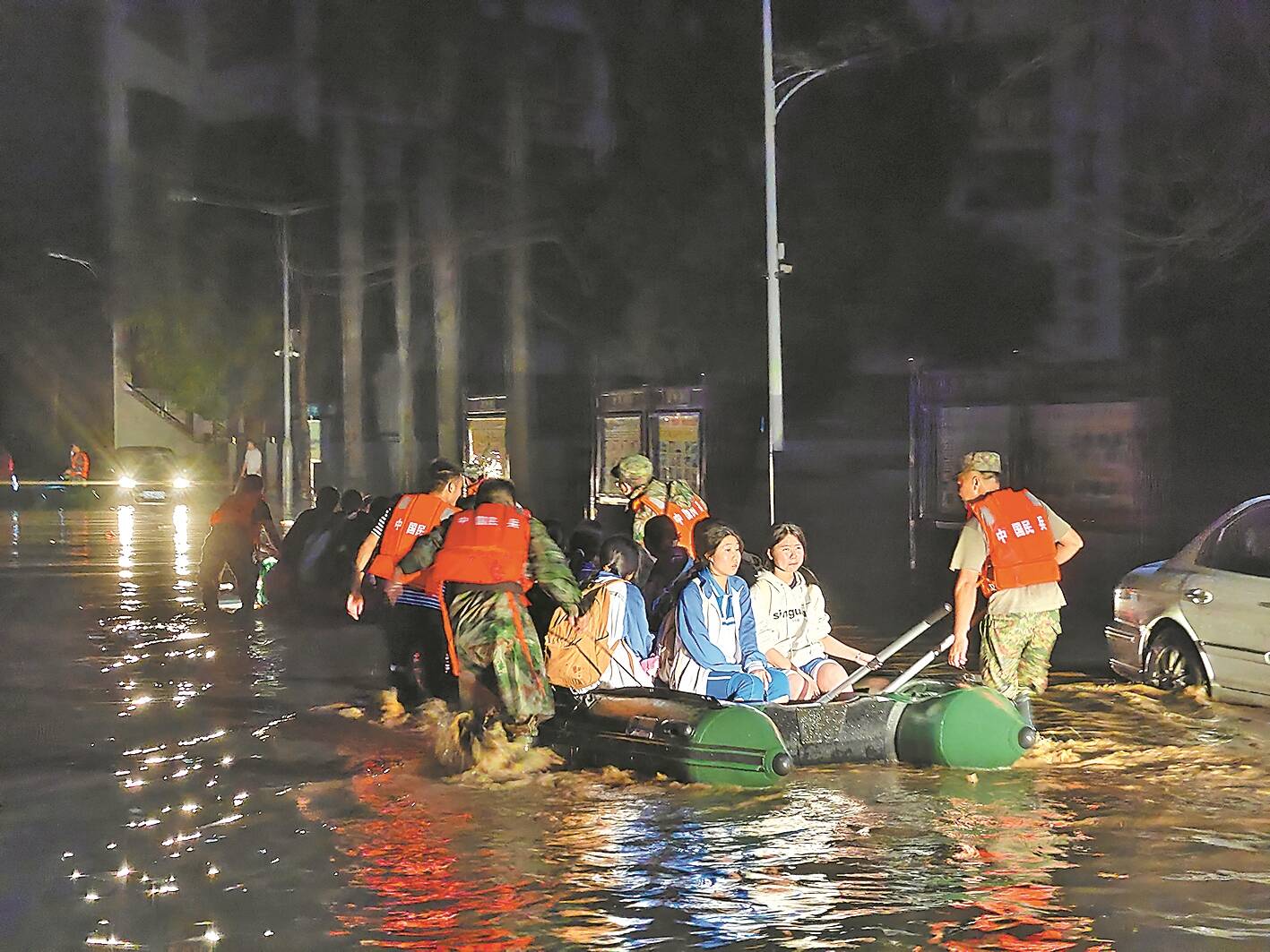 就这样,民兵队员们扛着装备跑了将近1公里,到达大梨村时已是气喘吁吁,但是面对紧急的汛情,大家顾不得腿软手麻,迅速操舟深入村庄转移群众。