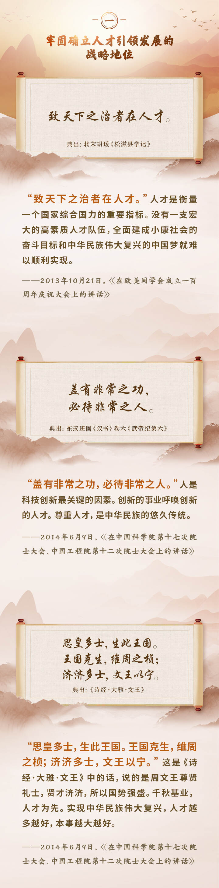 编者按:培养造就大批德才兼备的高素质人才,是国家和民族长远发展大计。党的十八大以来,习近平总书记围绕人才工作发表一系列重要论述,立意高远,内涵丰富,思想深刻,深刻回答了为什么建设人才强国、什么是人才强国、怎样建设人才强国的重大理论和实践问题。在这些重要论述中,总书记精妙运用古代典籍、经典名句,以古喻今、启迪思想、激荡精神,让我们一起来学习!