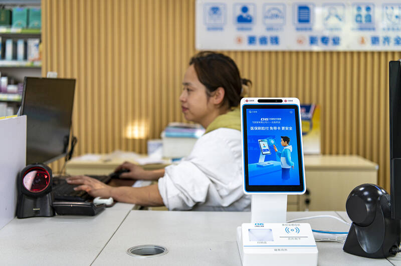 2024年4月10日,浙江金华市区一家民众大药房柜台上放着医保“刷脸支付”设备,群众看病更加便利。