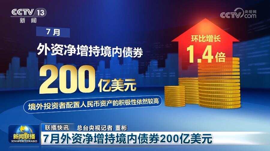 国家外汇管理局数据显示,7月,外资净增持境内债券200亿美元,环比增长1.4倍。境外投资者配置人民币资产的积极性依然较高。