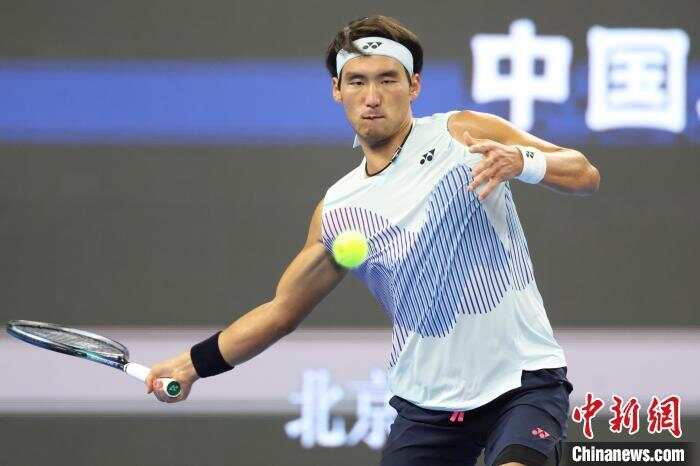 10月1日,2024中国网球公开赛(简称“中网”)在北京继续进行。持外卡出战的中国选手布云朝克特不敌2023年赛会冠军、世界第一辛纳,无缘晋级男单决赛。图为布云朝克特在比赛中。中新社记者 田雨昊 摄