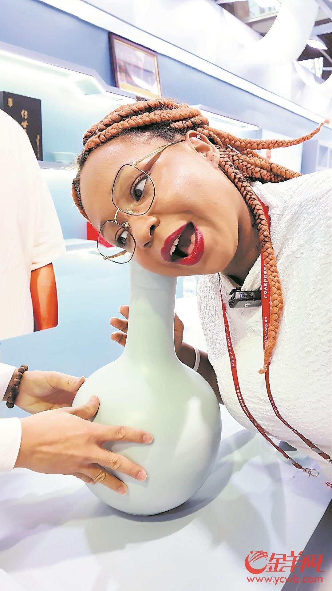 梅丽被另一家展位上的天青色汝窑瓷器深深吸引,工作人员刘佳成邀请梅丽将耳朵贴近瓷器瓶口。听到瓶中的声音时,梅丽惊讶地说:“这种声音就像山洞里回荡的风声!”
