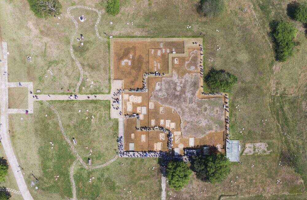 这是2024年4月18日拍摄的位于安徽省马鞍山市含山县境内的凌家滩国家考古遗址公园墓葬祭祀区(无人机照片)。新华社记者 傅天 摄