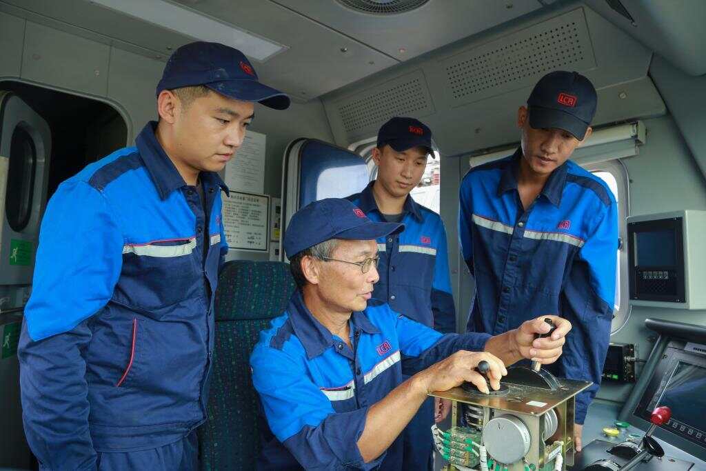 在中老铁路万象运营管理中心的机车检修库里,中老师徒4人一同对机车部件进行攻关(2024年9月9日摄)。新华社发(郑皓文摄)