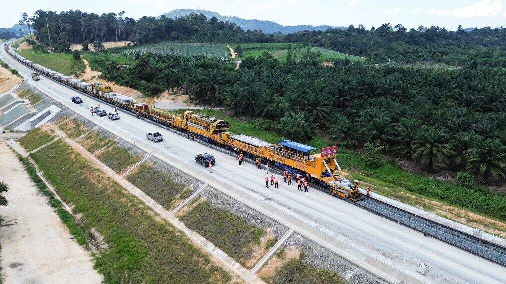 这是5月6日在马来西亚彭亨州航拍的马东铁项目的铺轨现场。新华社记者程一恒摄
