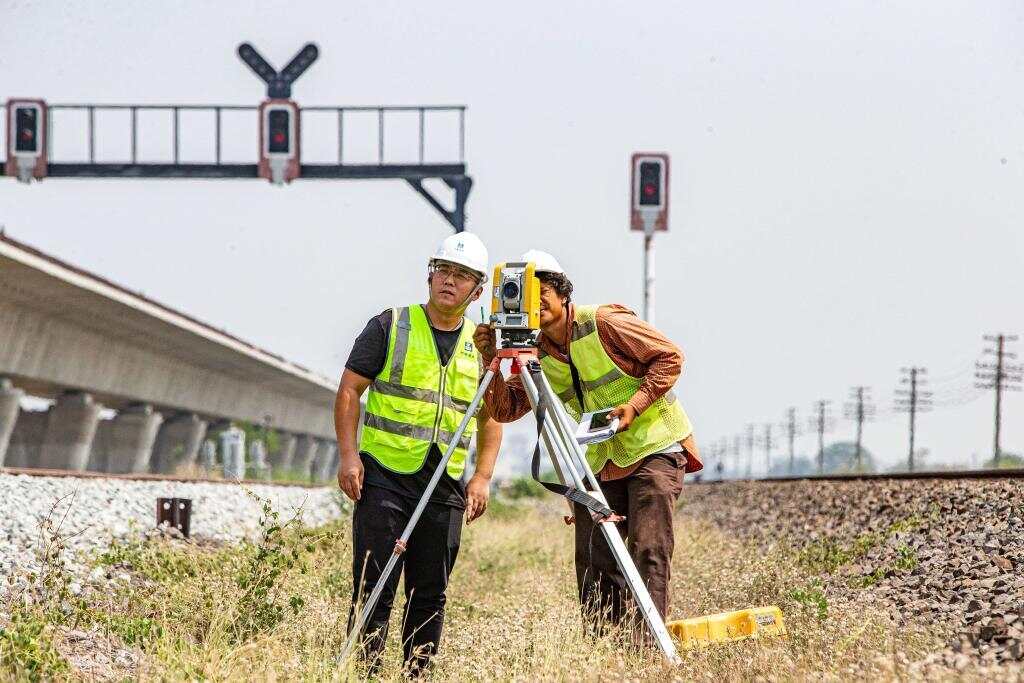 5月1日,在泰国大城府,中泰高铁项目工作人员在施工现场勘查。新华社记者王腾摄