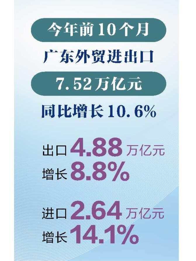 羊城晚报全媒体记者汪海晏,通讯员陈琳、吕美锦报道:据海关总署广东分署统计,今年前10个月,广东外贸进出口7.52万亿元,同比增长10.6%,同期全国增长5.2%,占全国进出口总值的20.9%。其中,出口4.88万亿元,增长8.8%;进口2.64万亿元,增长14.1%;贸易顺差2.24万亿元,扩大3.2%。