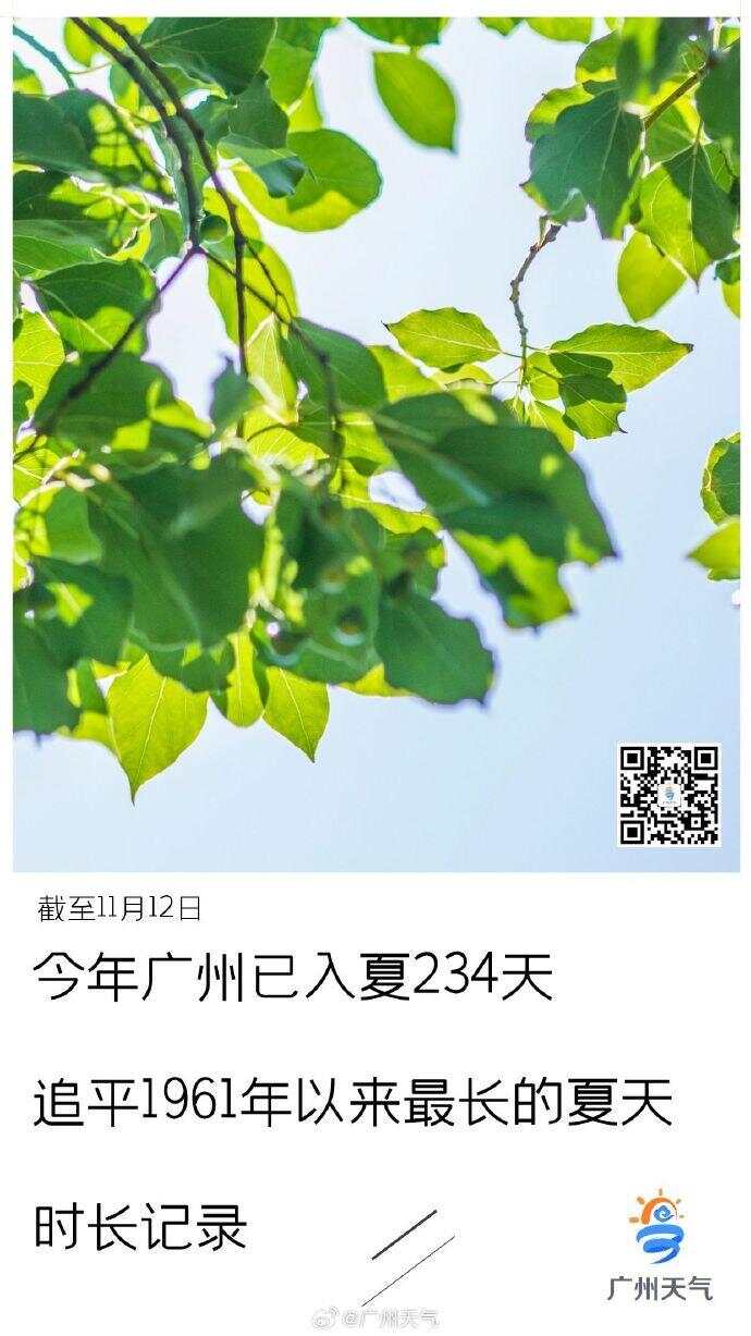 11月12日下午,广州市气象部门宣布,基于现有的气象监测数据及后续预报,截至今年11月12日,广州2024年已累计夏季日数共234天,已追平在1994年所创下的234天的“最长夏季”纪录。2024年内只要广州在气候上达到夏季标准的天数继续增加,广州都将继续刷新1961年以来“最长夏季”纪录。