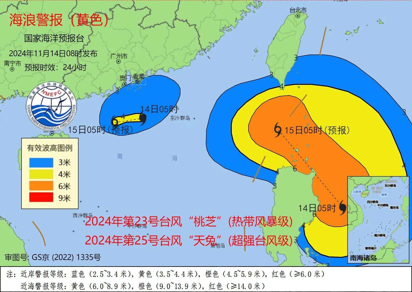 此外,受今年第23号台风“桃芝”的影响,预计11月14日中午到下午,南海北部将出现2.5到4米的大浪到巨浪区;广东近岸海域将出现2到3米的中浪到大浪,近岸海域海浪预警级别为蓝色。受今年第25号台风“天兔”的影响,预计11月14日夜间到15日中午,南海东北部、巴士海峡将出现4到8米的巨浪到狂浪区,近海海域海浪预警级别为黄色。请在上述海域作业的船只注意安全,沿海各有关单位提前采取防浪避浪措施。