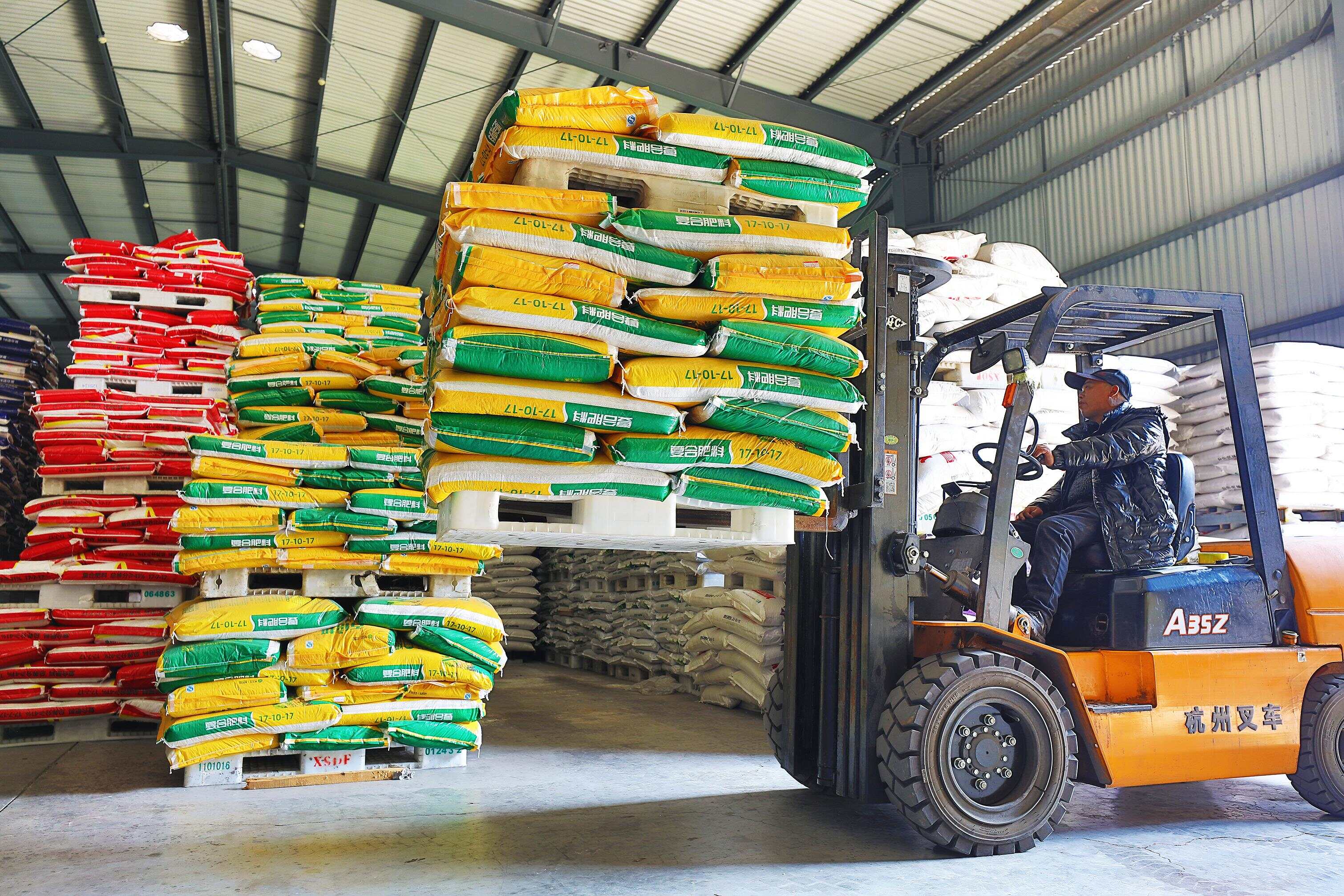 2023年2月15日,在浙江义乌供销联社的农资贮存仓库,工作人员正在调运复合肥料等农资。