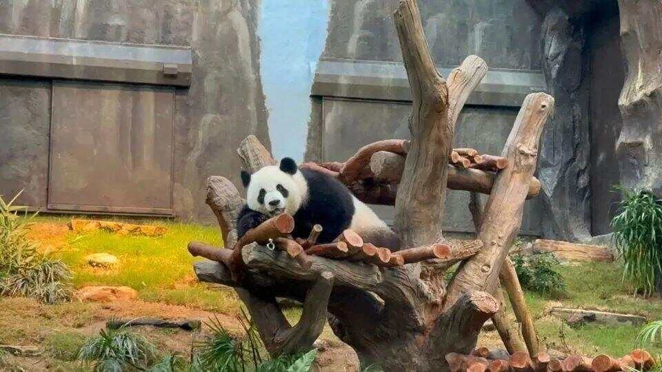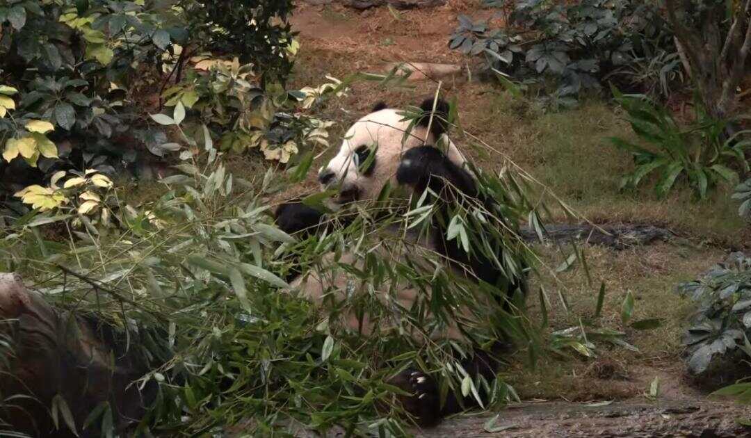 日前,海洋公园举行媒体见面会,“安安”和“可可”亮相。只见雌性熊猫“可可”爬到木制的休息处,趴在上面休息,又在场馆内找竹叶吃;雄性大熊猫“安安”则到处走动,而后躺在地上吃竹叶。