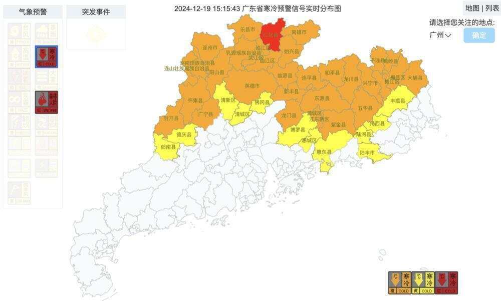 受持续补充冷空气影响,广东局地日最低气温在0℃以下,粤北局地在12月19日上午发布了广东下半年以来首个寒冷红色预警信号。