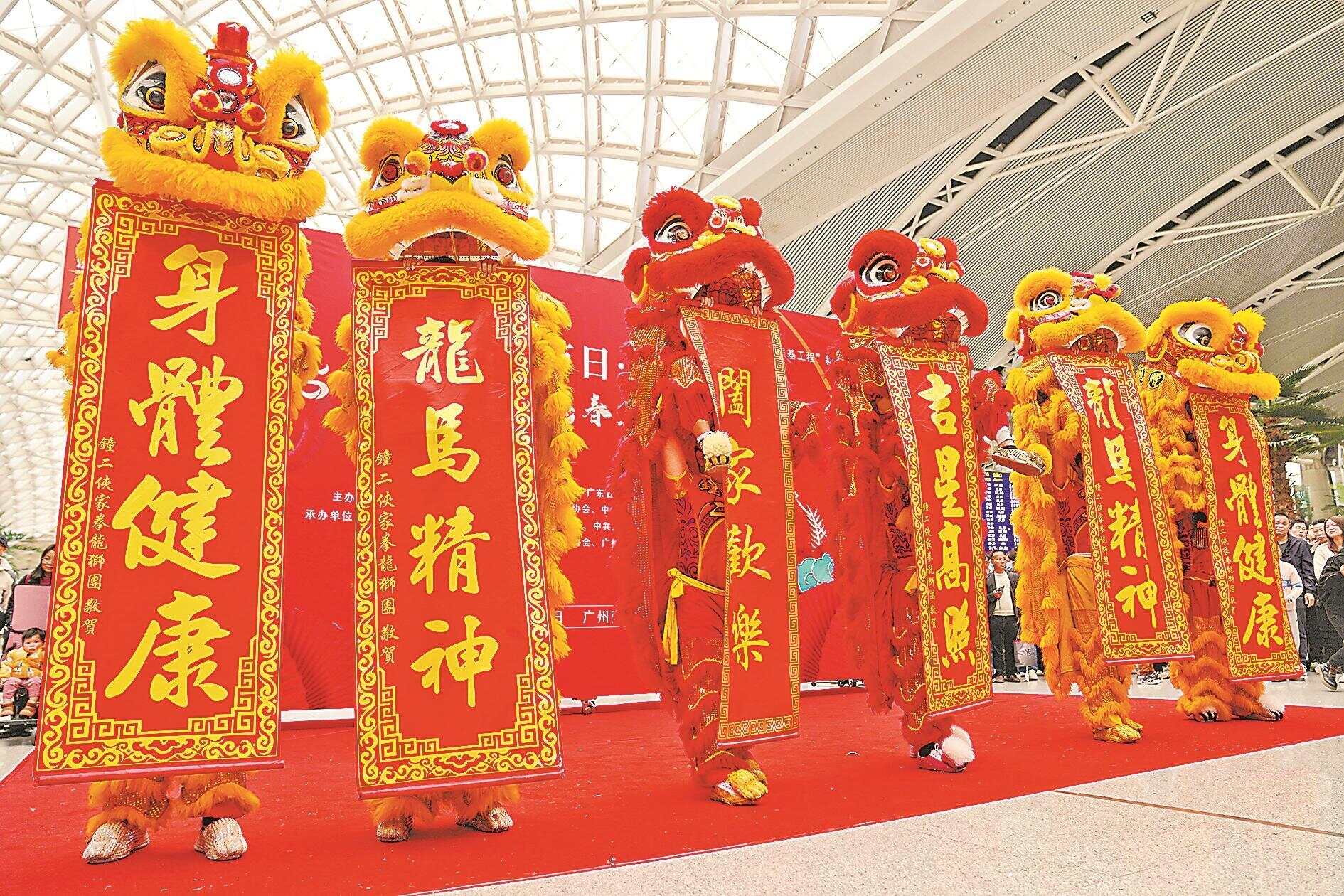 “咚咚隆锵,锵咚隆咚锵……”随着一阵锣鼓声响起,在广州南站候车室的正中央舞台上,一群雄壮的舞狮跃动翻腾,场面壮观,吸引了不少旅客驻足观看,洋溢着浓厚的节庆气氛。