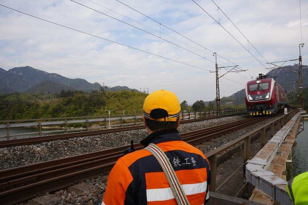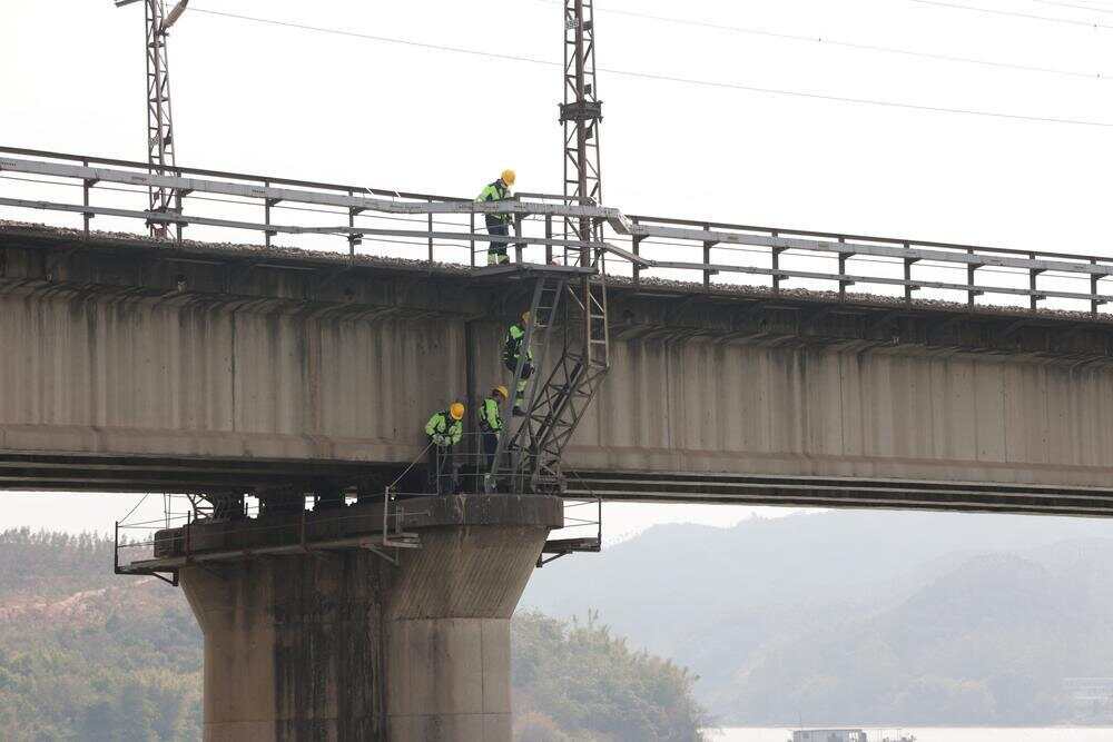 1月15日,2025年春运第二天,旅客们背起行囊,登上回家的列车。在鸡坑铁路大桥上,广铁集团广州工务段英德桥遂车间连江口桥隧重点维修工区的作业人员正在紧张地进行维修作业,悉心守护春运团圆路。