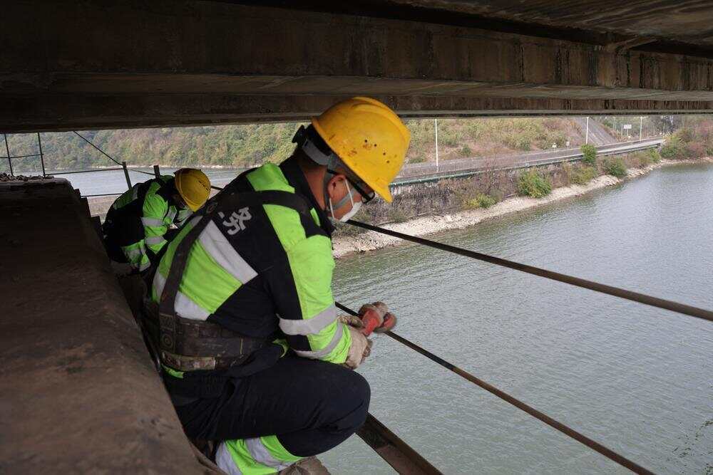 桥梁支座检查和固定吊篮除锈作业是一项难度高、挑战大的工作。检查人员需要从一个面积不足0.5平方米的梯口,顺着检查梯下到桥墩上,在狭小的固定吊篮上,小心翼翼地清理打磨锈蚀部位,而桥墩下就是滔滔江水。每次下到桥墩上作业时,工长涂文瑞都会反复叮嘱大家,作业绳有没有绑好,检查工具是否固定牢靠。
