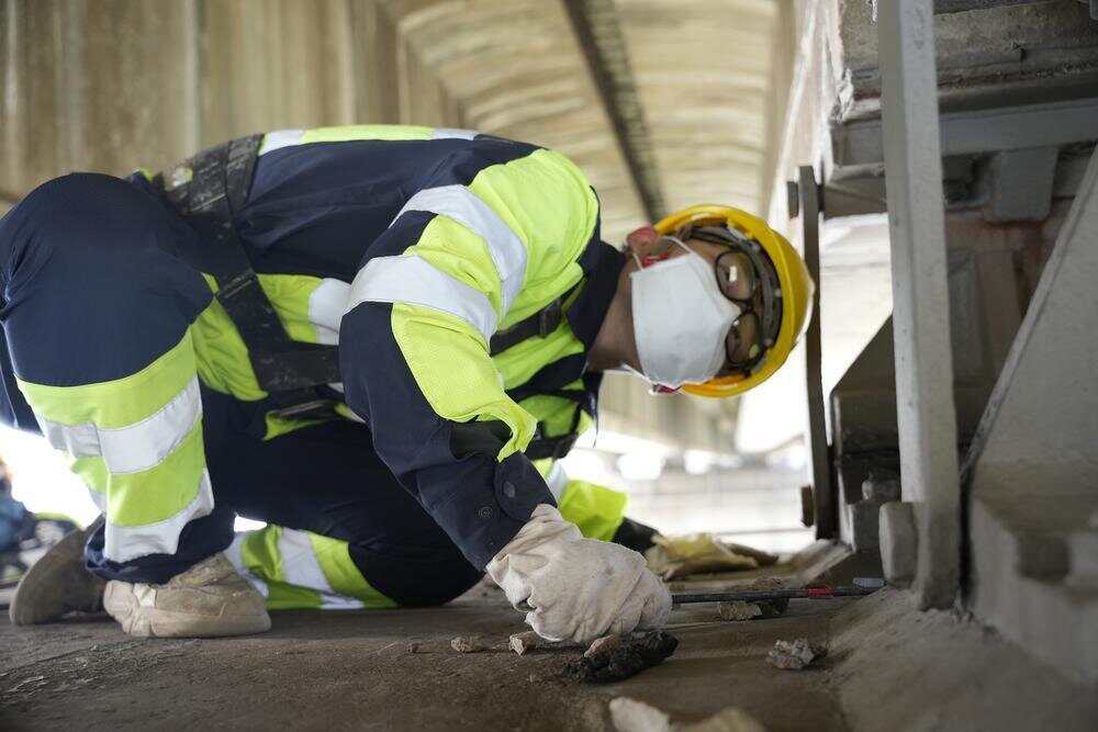 “9号桥墩右侧固定吊篮角铁锈蚀面积较大,我们要抓紧处理。”工长涂文瑞说完,旁边的作业人员董胖胖拿起铁铲迅速将铁路铲掉,再用砂纸进行打磨,清理干净后快速涂上底漆。
