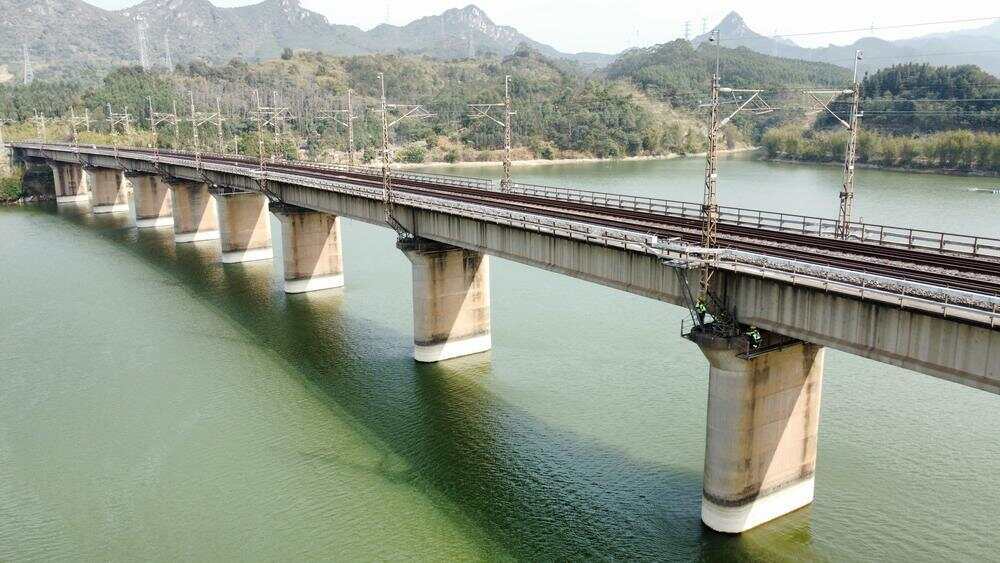 鸡坑铁路大桥位于清远市英德黎溪镇境内,横跨北江与240国道相望,是京广铁路广东境内重要的桥梁设施。为确保春运期间管内桥梁设备安全稳定,作业人员按照维修计划对该桥梁设备进行细致检查,有序开展桥梁墩台支座检查、固定吊篮除锈涂漆等工作。