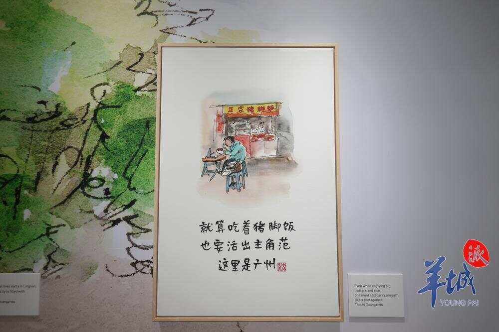 “就算吃着猪脚饭,也要活出主角范。”展览中,一幅描绘猪脚饭的漫画吸引了不少人的目光。熟悉的菜肴、朴实的台词,让人倍感温暖。