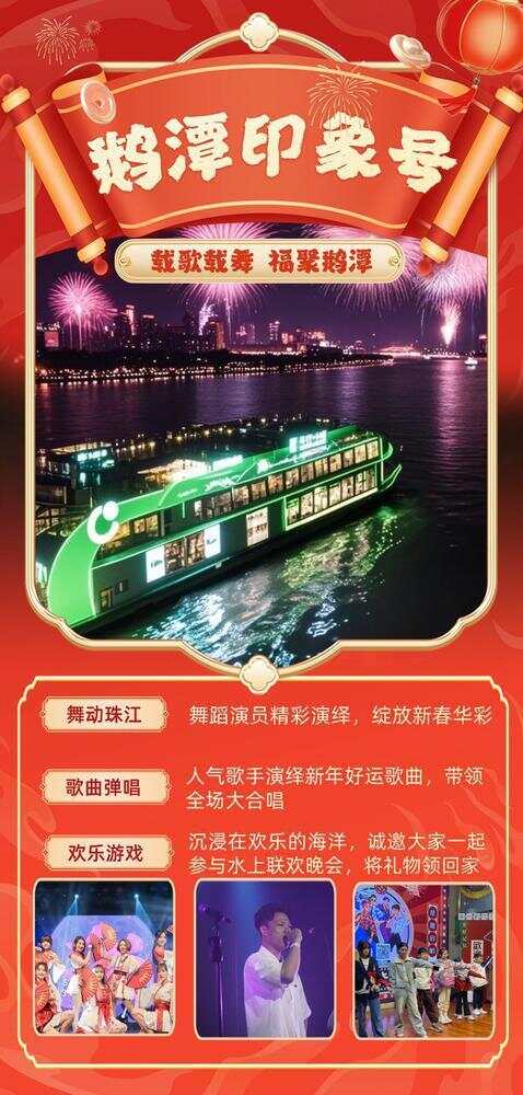 据介绍,广州客轮联同广州之星安排了鹅潭印象、远海启航、南海神号、珠水百年号、广州财富号和珠水信息号共6艘游船,将于1月29日晚分别从天字码头和海心沙西区码头起航,沿途欣赏珠江西面的迷人夜景,最终抵达白鹅潭,为乘客提供一个绝佳的观赏烟花汇演的位置。航班上不仅提供美味、具有广州特色的自助餐,还安排财神爷等互动游戏和精彩表演,让乘客在享受美食的同时,也能感受到浓厚的节日氛围。