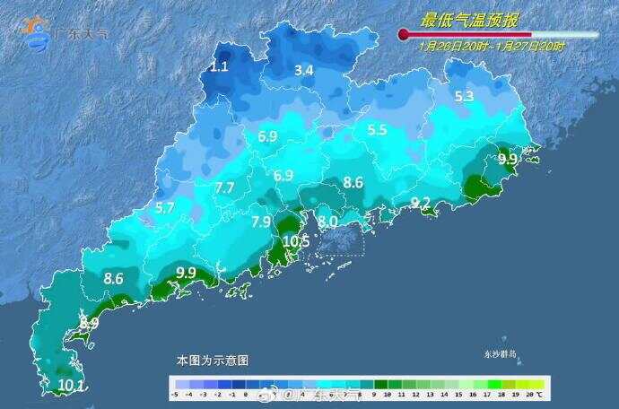 预计1月27日-29日,广东大部以多云到晴天气为主,天气寒冷,中北部市县最低气温2~5℃,高海拔山区零下3℃~0℃,有冰冻或霜冻。