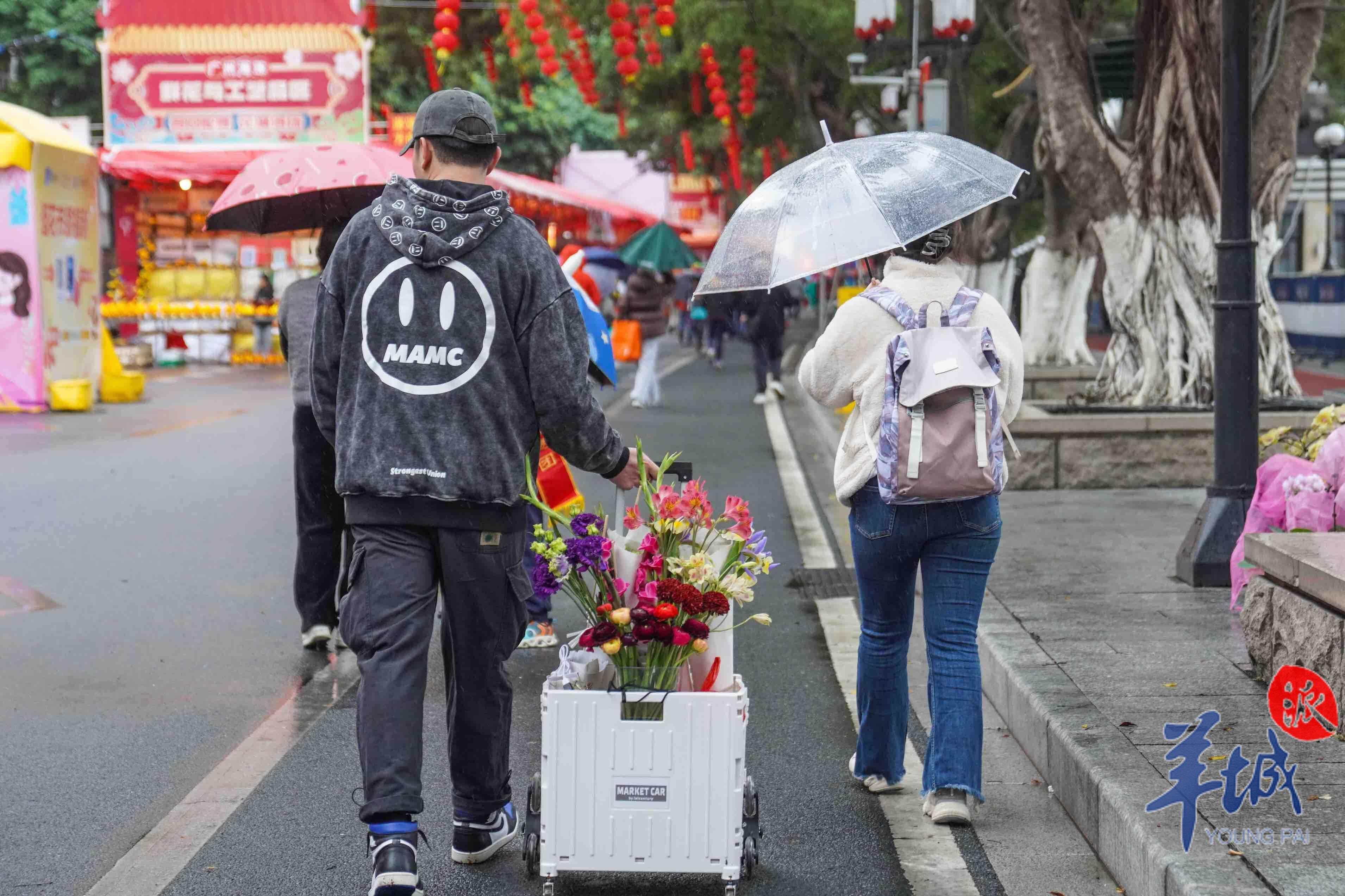 冒着寒风细雨逛花市,似是天公不作美,但这恰是广东的年味,亦别有一番风味。