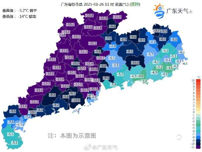 昨日(1月26日)11时,受冷空气影响,广东多地降温幅度达到10℃以上,其中变温最厉害是郁南,24小时速降14℃。清远连山金子山顶出现了-3.2℃的低温,韶关高寒山区冷出了冰挂雾凇。