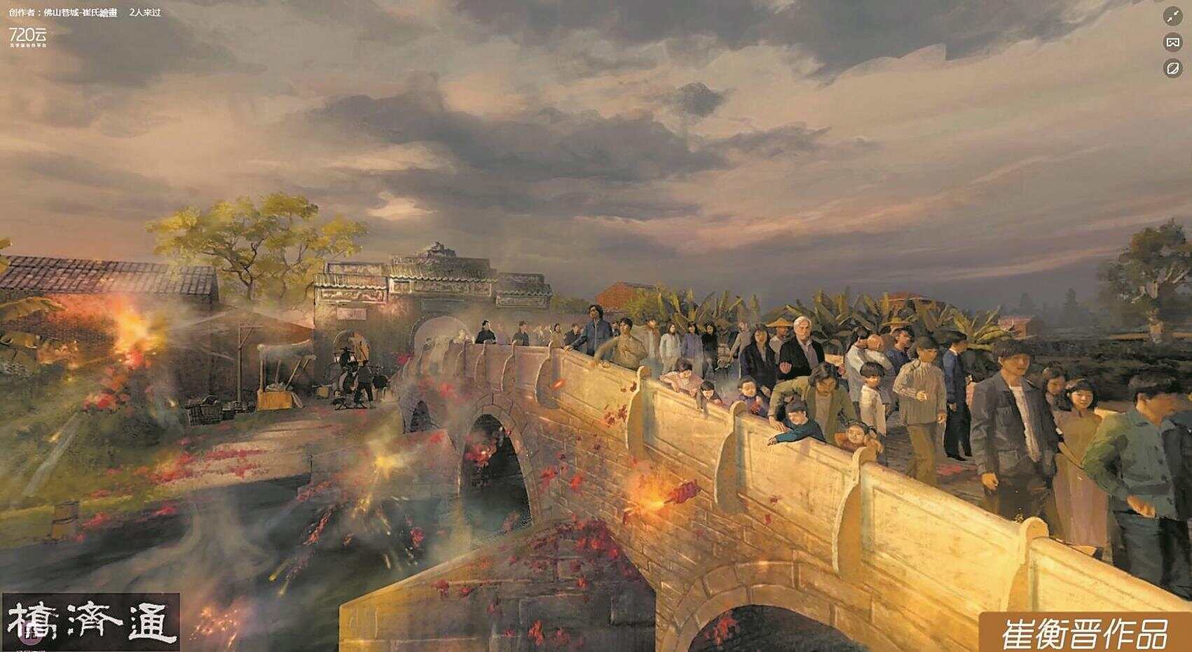 你见过70年前佛山“行通济”的盛况吗?2月11日,佛山“行通济”民俗再次开启,值此之际,佛山本土艺术家崔衡晋用VR技术720度全景还原昔日“行通济”景象——爆竹声声,烟雾缭绕,人们手提生菜和元宝穿过通济桥,其乐融融,热闹非凡。