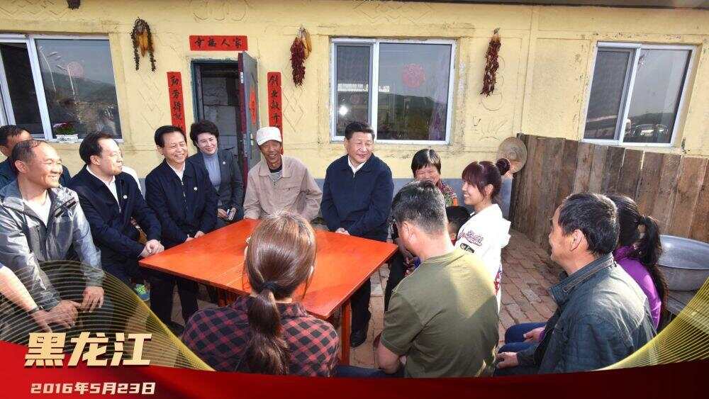 2016年5月23日,习近平在黑龙江伊春上甘岭林业局溪水经营所林场职工刘养顺家,同一家人和街坊四邻围坐在小院里聊家常,了解停伐后林业工人的收入渠道。