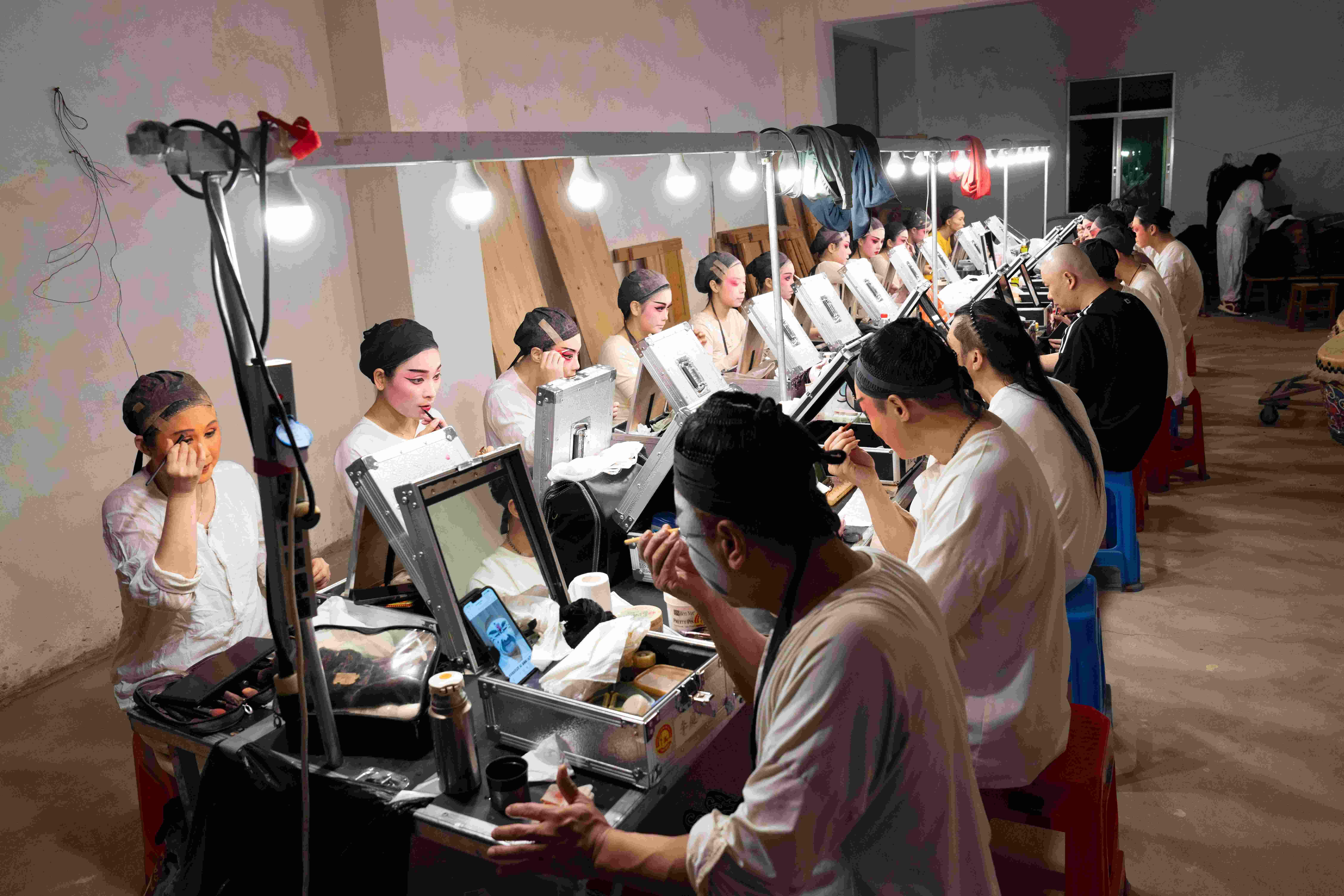 在吴川鱼笱埠的后台里,年轻戏迷小陈在用相机仔细纪录着广州粤剧院艺术家们忙碌的准备工作。他也是资深戏迷,今年特意请假一周,从广州到粤西追春班。