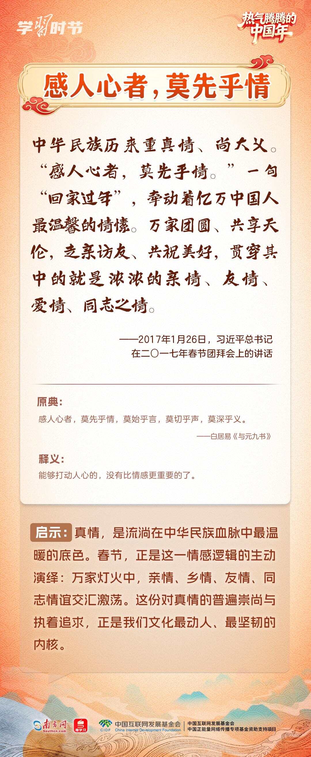 “在中国式现代化新征程上策马扬鞭、勇往直前,共同开创更加美好的未来。”2月14日,在二〇二六年春节团拜会上,习近平总书记的重要讲话振奋人心。党的十八大以来,习近平总书记多次在春节团拜会上发表重要讲话,回望旧岁、展望新年,向大家致以美好的新春祝福。在讲话中,习近平总书记常常巧妙引用古典名句砥砺人心,指引我们脚踏实地、锐意前行,提醒我们珍视亲情、涵养孝道。一起来学习感悟。