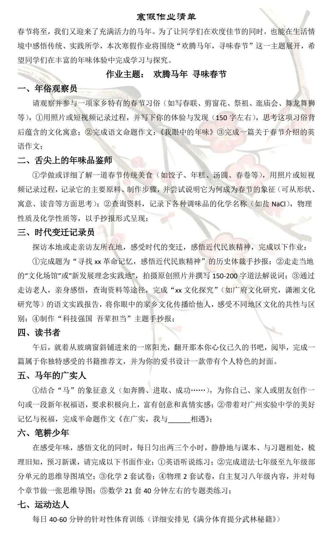 愿同学们在这个寒假,既有“偷得浮生半日闲 ”的悠然,亦有“吾将上下而求索 ”的勤勉。在阅读中见天地,在陪伴中知温情,在独处中明心志,在锻炼中强体魄,在欢愉中养精神。