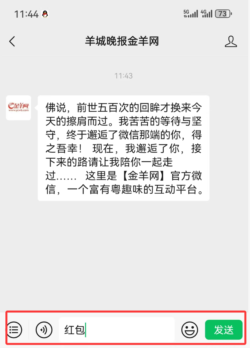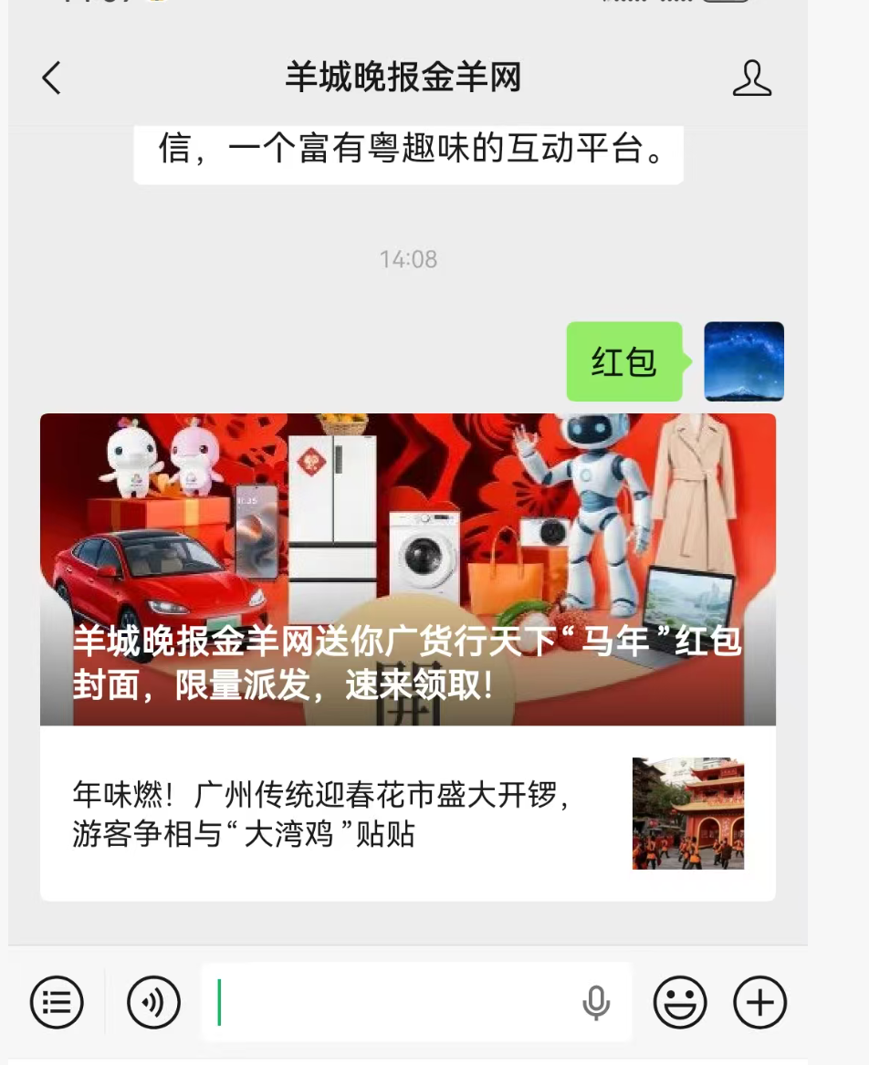 关注“羊城晚报金羊网”官方微信公众号,在微信对话框输入“红包”,点击链接,即可把这份大礼收进手机。今年过年派红包,不用千篇一律的默认款,用羊城晚报定制封面,包的是心意,发的是底气!祝大家在即将到来的马年里: 事业马到成功! 生活一马当先! 钱袋子“马”上鼓起来!