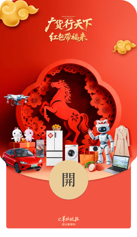 今年春节,“广货行天下”活动正火爆出圈,咱们广东的好物正走向全球!为感谢陪伴大家多年的“老友记”,羊城晚报、羊城派、金羊网特意为大家准备了一份重磅新春贺礼——“广货行天下·羊晚马年限定”红包封面正式亮相!
