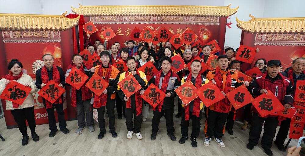 2024年1月16日,在北京的中国职工之家工会驿站举行的万福迎春——2024年“送万福、进万家”书法公益活动上,快递小哥展示福字。