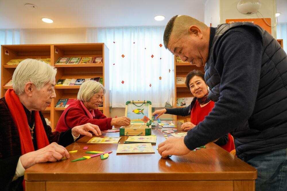 2月10日,社区内老年人玩益智游戏。