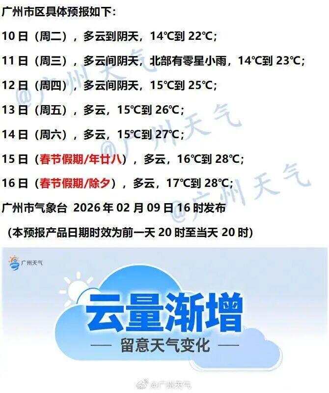 广州方面,这两天多云加持不晒不闷,逛花街、出行都舒适,洗晒和大扫除建议在13-15日进行更适合。