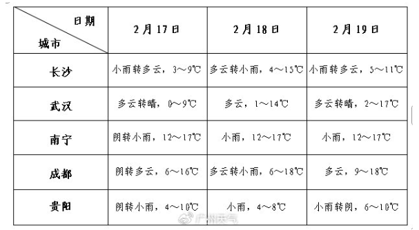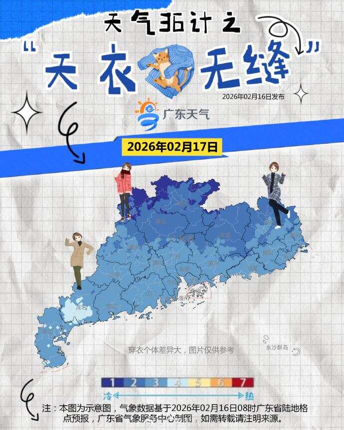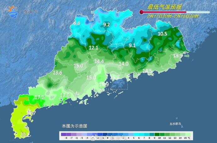 17日(初一),广东省大部市县零星小雨转多云。早晨最低气温:粤北偏北市县7~10℃(高海拔山区3~6℃),粤西和珠江三角洲南部市县17~20℃,粤北偏南市县和珠江三角洲北部市县10~14℃,其余市县14~17℃。