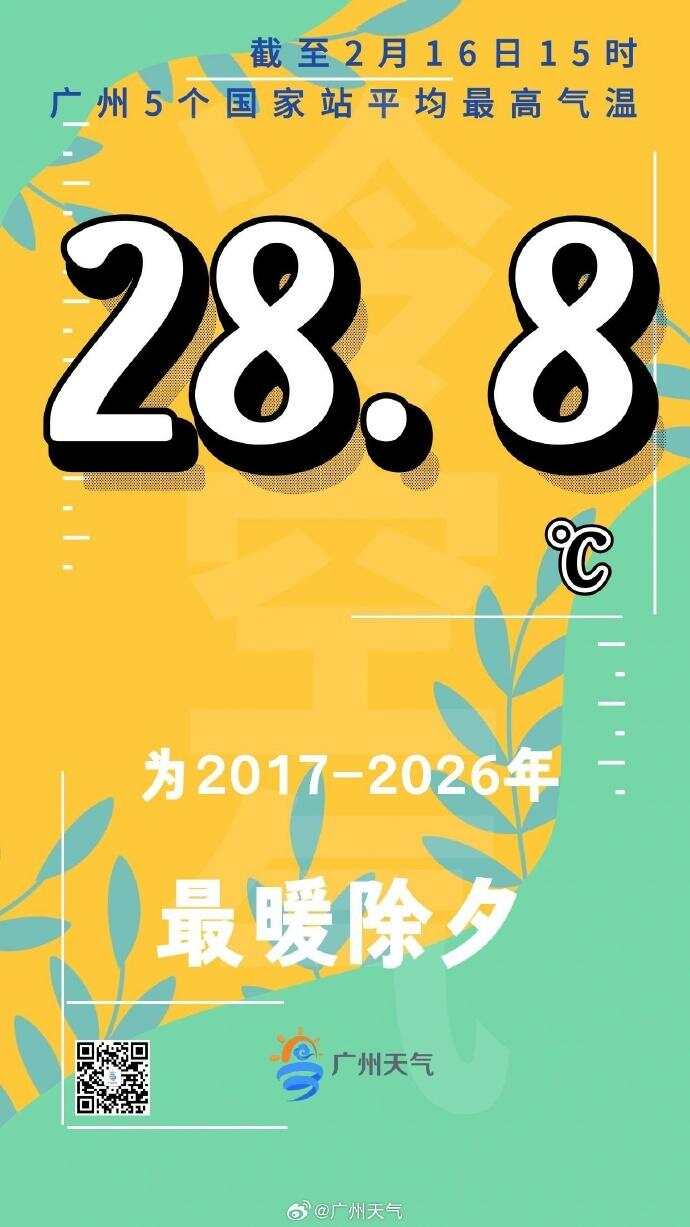 根据广州5个国家站近十年(2017年至2026年)气象资料统计,2026年除夕当天,5个国家站最高气温平均达到28.8℃,创下近十年除夕气温新高。不少网友直呼:“这是穿着短袖吃的年夜饭!”