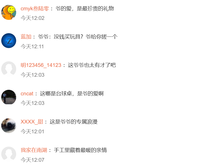 据了解,下洞村是鹤峰县五里乡的偏远乡村,春节假期,爷爷怕返乡过年的孙子没有玩具,便为孙子“搓”了一张台球桌。爷爷凭着一双巧手和满心疼爱,就地取材、慢慢打磨。用家中闲置的木板当桌面,用乒乓球、圆石头当球,废塑料瓶作袋,为孙子制作“全球限量款”玩具。