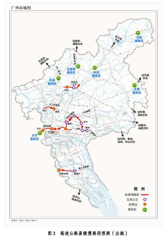 返程高峰期间,预计北环高速(沙贝—广花收费站段)、机场高速(平沙立交—黄石立交段)、乐广高速(银盏隧道)、大广高速(米埗站—温泉站段、机场北立交—山前段)、机场第二高速(高增立交—北村立交段)、华南快速(春岗立交—龙洞收费站段)、广河高速(八斗立交—春岗立交段)、北二环高速(长平立交—火村立交段)、京港澳高速(火村立交—萝岗收费站段)、东新高速(南浦—东沙段)、东南西环高速(三滘立交-海南立交段)、广台高速(金山湖站—大夫山段)、南二环高速(鱼窝头站—东涌互通段)、广澳高速(灵山站—坦尾立交)、黄埔大桥等瓶颈路段、互通立交短时车流量较大,易发生缓行情况。