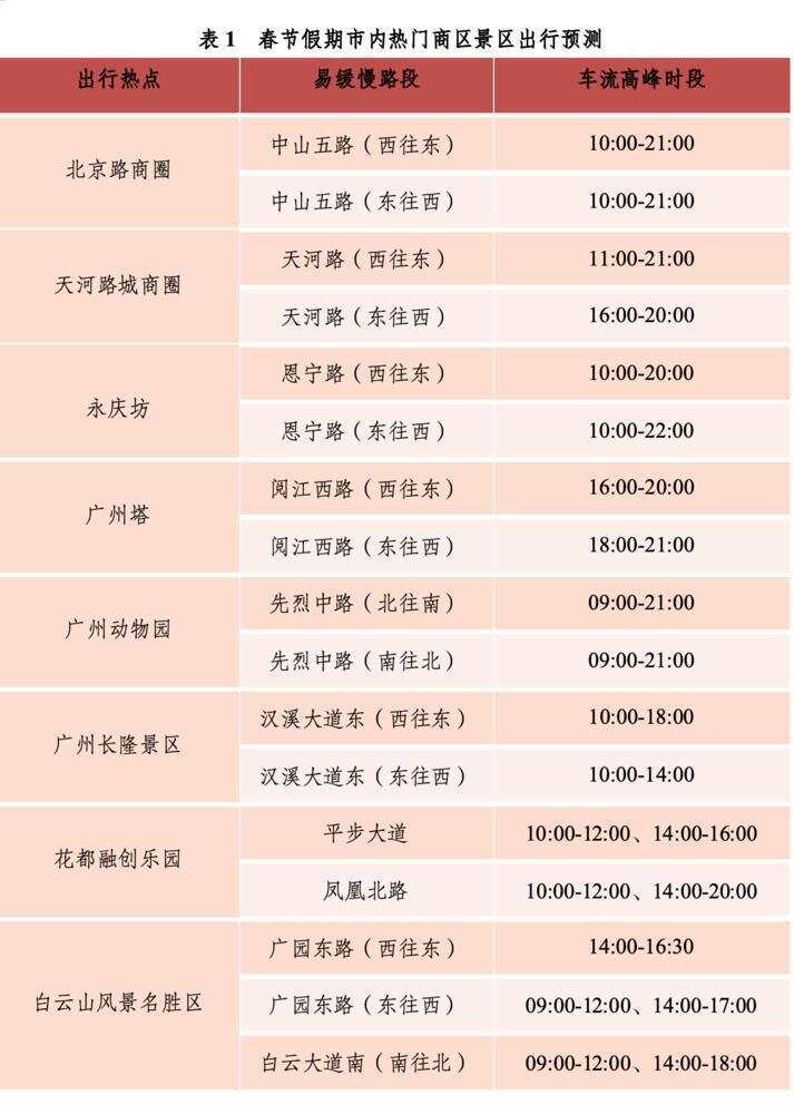 重点商圈景区:北京路商圈、天河路商圈、永庆坊、广州塔、广州动物园、长隆旅游度假区、花都融创乐园、白云山风景区等热门目的地,假期期间每日10时至21时易出现持续性车流人流密集。