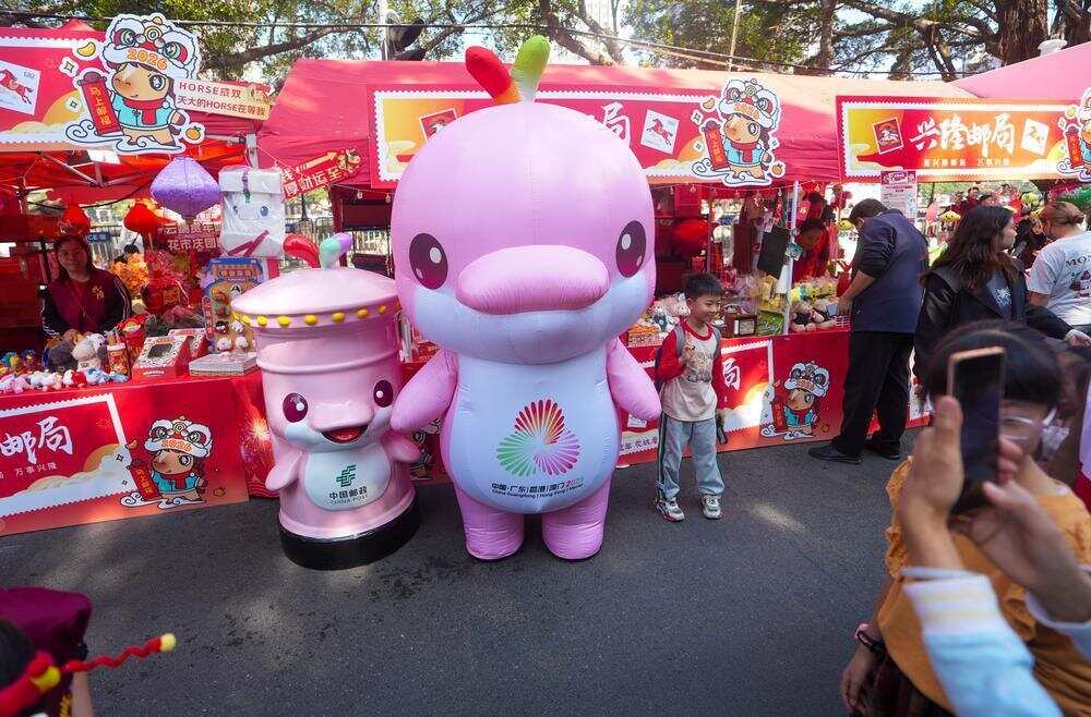 记者2月14日现场看到,一只“大湾鸡筒”设置在海珠滨江花市广州邮政的摊位前。不少“行花街”的市民看到“大湾鸡筒”,纷纷称赞“可爱”,不少“大小朋友”还与“大湾鸡筒”合影留念。