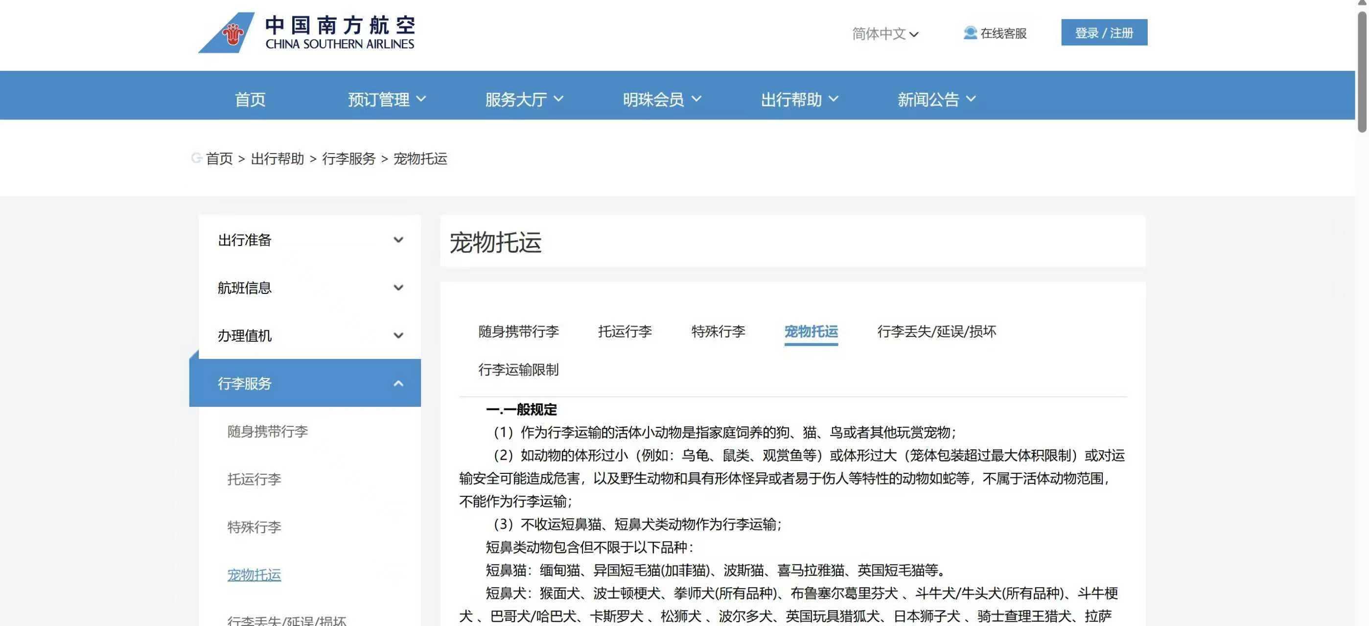 以中国南方航空为例,其官网对宠物托运作出了详细的规定和要求,动物体形过小或过大不能作为行李运输;短鼻猫、短鼻犬类动物不能作为行李运输;作为行李运输的活体小动物必须装在供氧的货舱内运输(导盲犬和导听犬除外),不适合放在货舱运输的小动物不予收运等等。